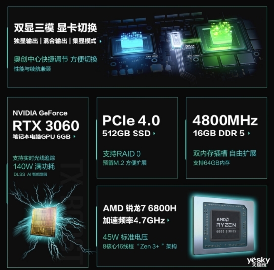 ??今年有一個游戲本不可或缺的功能同樣在天選3銳龍版上搭載,這就是——雙顯三模,這一功能方便用戶自由選擇不同場景,保持在合適的性能場景。如果用戶帶著天選3銳龍版外出,集顯輸出模式也能提升電池續航。