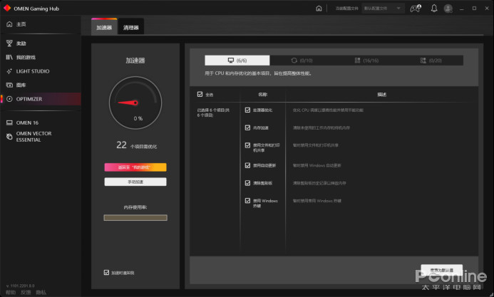 游戲本除了需要強大的硬件、豪華的散熱,還需要優(yōu)秀的性能調(diào)度才能發(fā)揮出全部的性能,但這種超頻、提高風(fēng)扇轉(zhuǎn)速等操作在以前都是DIY大神的專屬,普通玩家拿到手往往需要一定學(xué)習(xí)成本。OMEN暗影精靈8就很貼心地為玩家將這些功能集成在系統(tǒng)軟件中——惠普游戲控制中心(OMEN Gaming Hub),小白玩家也能在軟件內(nèi)一鍵開啟性能的“狂暴模式”,盡情享受火力全開的快感,也有“自動智能降壓”功能,讓設(shè)備在在保證性能的前提下有效降低發(fā)熱等等,極大提升用戶的對游戲本性能、續(xù)航的不同需求。