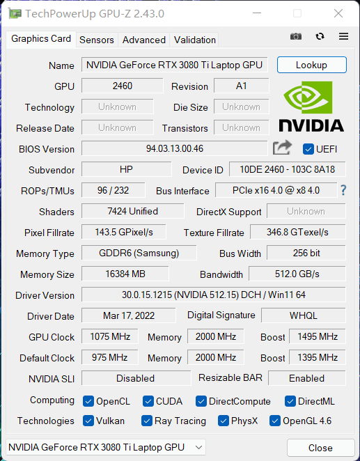 規格方面,RTX 3080Ti筆記本電腦GPU擁有7424個CUDA核心,256bit總線位寬,帶寬512GB/s,顯存為16GB GDDR6,核心頻率1075MHz,顯存頻率2000MHz,Boost頻率1495MHz,規格相對RTX 3070Ti近乎翻倍,性能十分強悍。