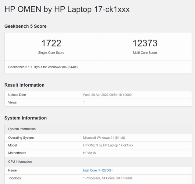 Geekbench 5測試標準下,實測酷睿i7-12700H處理器單核得分1722分,多核得分達到了12373分,相比11代酷睿i7-11800H的多核心成績9300分而言,多核心方面的性能有了巨大的提升。