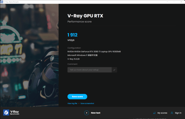 在V-Ray BenchMark的GPU渲染測試部分(CUDA),這顆RTX 3080Ti Laptop GPU得到了1308 vpaths的分數。而在V-Ray BenchMark的GPU光線追蹤測試部分(RTX),則得到了1912分。從這兩項分數來看,相對于其他品牌搭載RTX 3080Ti顯卡的機型,OMEN暗影精靈8Plus的得分也是要高一些的。