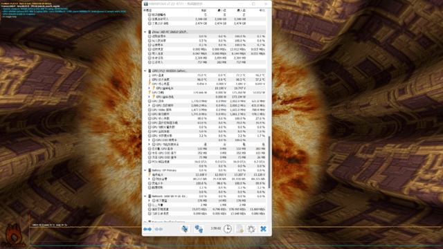 CPU+GPU雙烤機測試下,處理器核心溫度為94℃,高性能核3.0GHz,高效能核心為2.5GHz。此時其顯卡溫度為76.9℃,CPU+GPU功耗釋放達到69W+155W,CPU與GPU性能均達到最佳狀態,整體調校優秀。