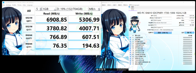 而硬盤方面,通過Crystal DiskMark8.0.1進行測試,結果顯示,實測其讀取速度6908.85MB/s,寫入速度5306.99MB/s,4K隨機讀取速度為76.35MB/s,寫入速度為194.63MB/s,均處于較高的性能水平。