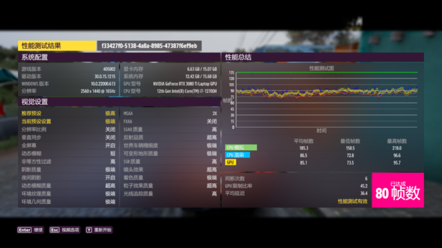 在《地平線5》中,2K分辨率,預設超高畫質,運行游戲內置的BenchMark,平均幀數為80幀,游戲可以非常流暢的運行,要知道這種賽車游戲,飆起來只有速度快,才能帶來極度的開心感。