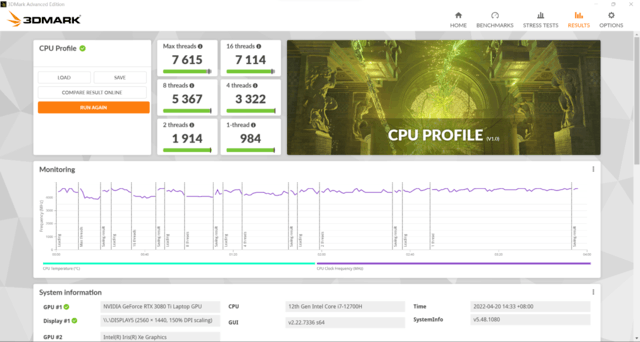 3DMark的CPU PROFILE可以對處理器進行單線程到多線程的全部測試,在這一測試標準下,英特爾12代酷睿i7-12700H處理器單線程得分高達984,2線程得分1914,4線程得分3322,8線程得分5367,16線程得分7114,最大線程數綜合得分7615,單線程與多線程性能得分可以看出,運算的速度提升明顯。得分代表了筆記本在運行單線程應用或是多線程應用時的運行速度,如此得分,大大節省了用戶在應用時的等待時間。