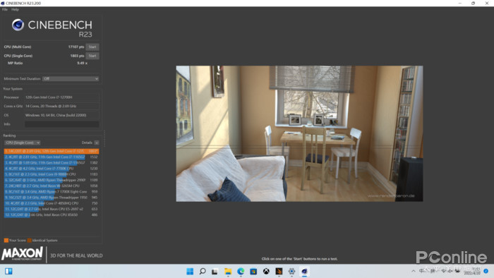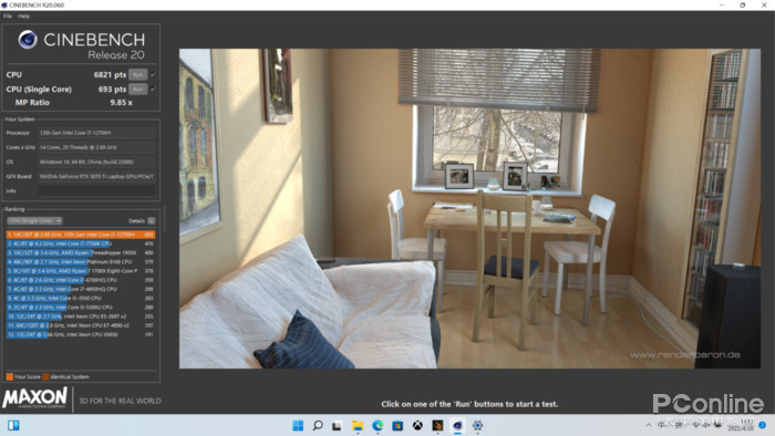 在渲染測(cè)試方面,通過(guò)R20的測(cè)試,單線程693pts,多線程6821pts。