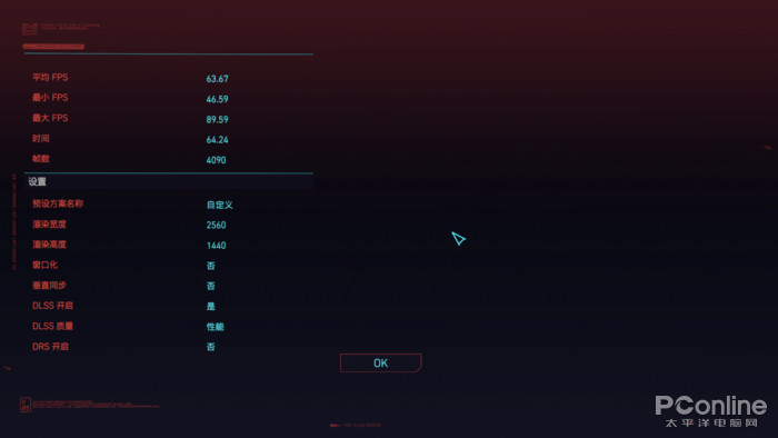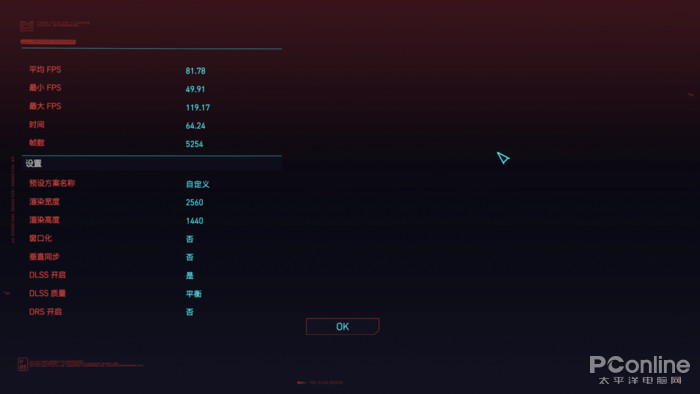 我們首先選擇超級(jí)畫(huà)質(zhì)模式,并開(kāi)啟平衡模式的DLSS功能,通過(guò)游戲內(nèi)部Benchmark測(cè)試,最后擁有平均幀數(shù)81FPS的完美表現(xiàn)。