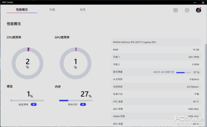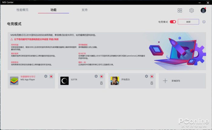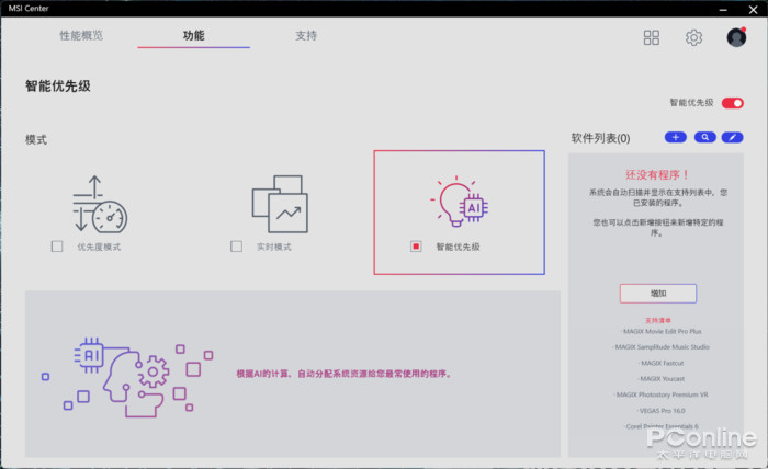 另外值得一提的是,MSI Center內(nèi)除了提供模式切換的功能外,還有著性能概覽功能(方便了解機(jī)身內(nèi)部的硬件狀況)、電競(jìng)模式(可以針對(duì)游戲自動(dòng)優(yōu)化系統(tǒng)效能)、智能優(yōu)先級(jí)(根據(jù)使用習(xí)慣,自動(dòng)分配系統(tǒng)資源給常用程序)幾大模塊,對(duì)于用戶的日常使用有著不小的助力作用。