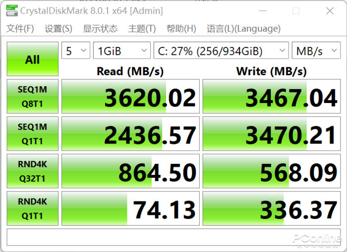 在硬盤方面,通過(guò)CrystalDiskMark測(cè)試,讀取速度為3620.02MB/s、寫入速度3467.04MB/s,也能滿足大部分玩家的需求。