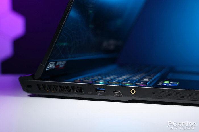 接口方面,微星沖鋒坦克Pro GP76左側(cè)提供了一個(gè)Type-A USB3.2 GEN 1、一個(gè)Type-C USB3.2 GEN 2(支持DP1.4)以及一個(gè)耳麥接口。