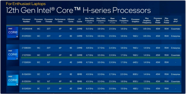 接下來是H系列,也就是我們常說的標準電壓處理器。其基本功耗為45W,酷睿i5的幾款產品的turbo功耗高達95W,酷睿i7/i9高達115W。可以說上限很高了,而且主要是針對游戲產品。當你看到處理器“酷睿iX-12XX0H”的時候,你就可以知道這款產品的性能會很強。明確地