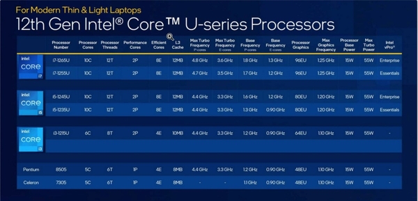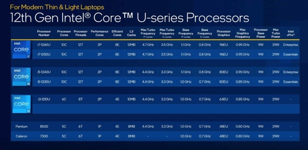 首先是針對輕薄本的低功耗U系列。12代酷睿明確分為U15系列和U9系列。兩個系列的規格參數會有所不同,最明顯的就是功耗。U15系列基本功耗15W,最高渦輪功耗可以達到55W,上限比較高。當然這也需要廠商根據產品體積和散熱配置來把握。當你看到“酷睿iX—12X5U”形式的處理器時,你可以判斷它是U15系列的低功耗處理器,主要用在一些普通的輕薄本上。