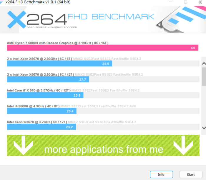 這是一個有代表性的編碼能力測試工具,可以測試CPU的H264編碼性能。測試結果是FPS,代表CPU每秒可以渲染的幀數。結果值越高,CPU性能越好。