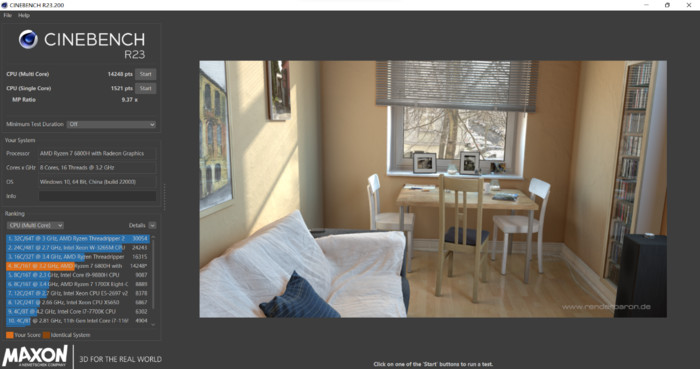 AMD銳龍7 6800H處理器的田璇3多核成績14248,單核成績1521。