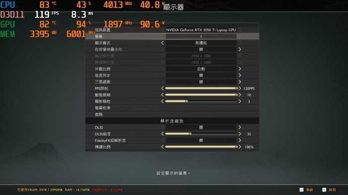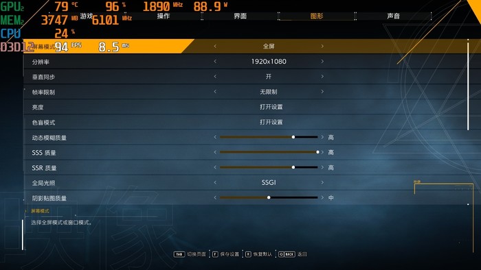 游戲屏幕設置調整為1080P分辨率,全“高”畫質,DLSS分辨率設置為“關”模式。