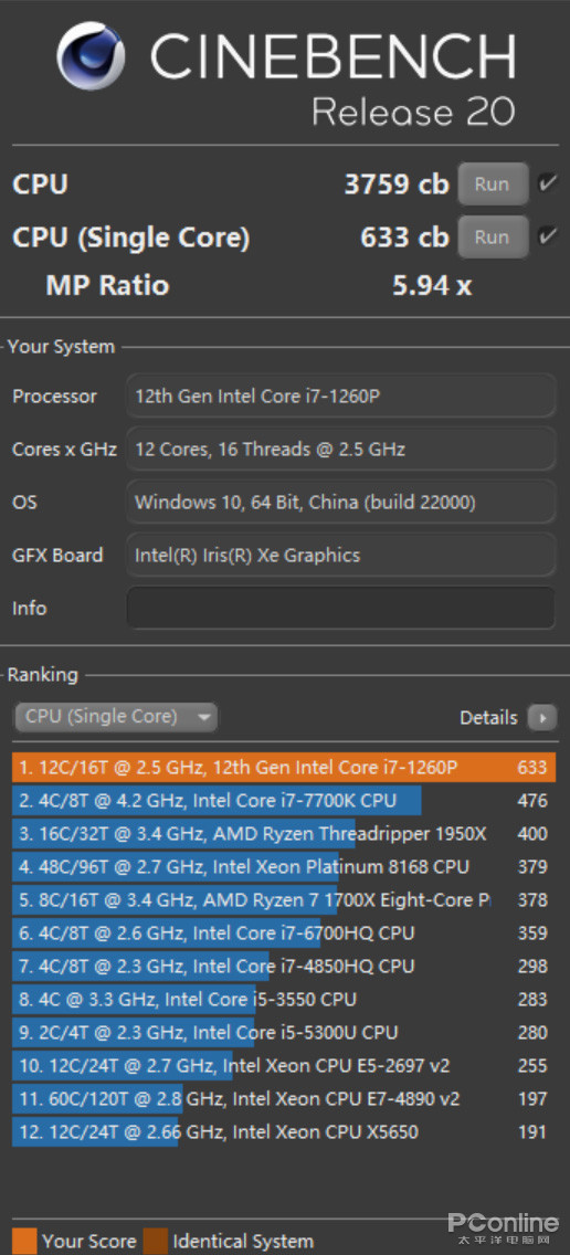 Cinebench是基于Cinema 4D開發(fā)出的基準測試,能反映出處理器的渲染能力。R20版本中,單線程得分為633cb,多線程得分為3759cb;R23版本中,單線程得分為1656pts,多線程得分為10035pts。