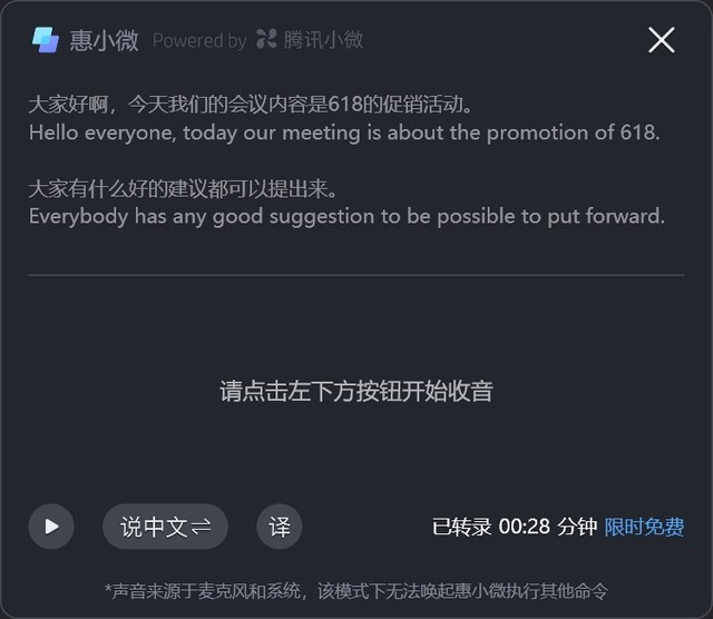 此外,在開會時,惠小微還可進行英文的會議實時翻譯,就算你對英文不是很熟悉,依然可以深度了解會議的內容。更重要的是,會議轉錄功能極為實用,可以輕松幫你記錄會議過程,讓你不在錯過每一個核心要點,從而成為全場的焦點。