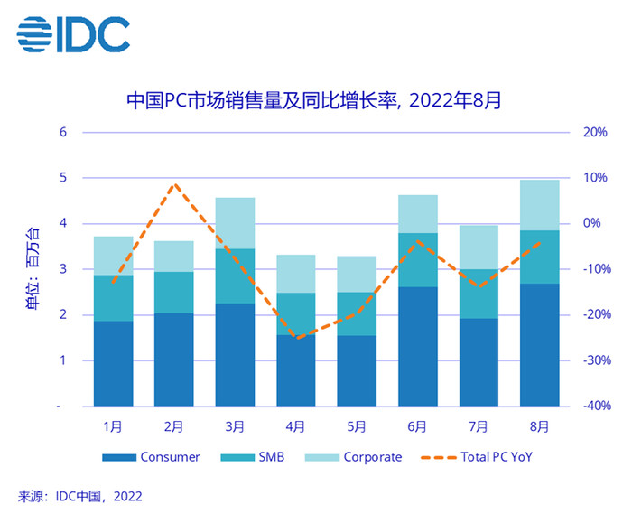 受開學季和818電商節影響,來自IDC數據顯示,2022年8月PC銷量為496萬臺,同比下降4.1%。消費市場銷量為269萬臺,同比增長10.2%。