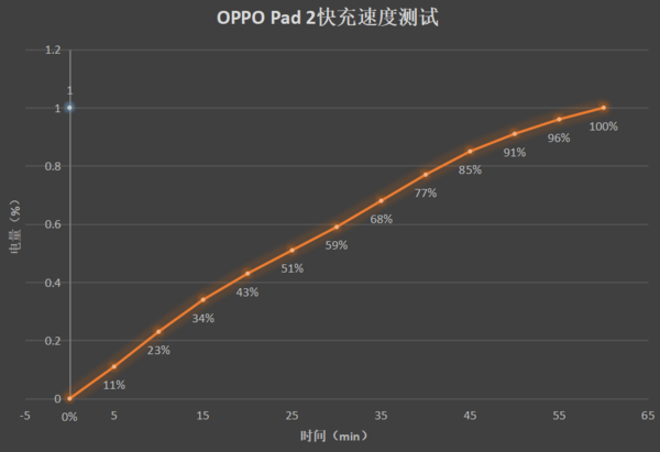 ??充電測試方面,我們將OPPO?Pad?2放電至關機進行充電測試,充電10分鐘約充進23%的電量,可滿足3小時左右輕辦公處理,全部充滿花費時間為64分鐘左右。