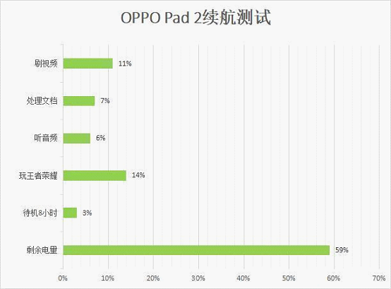 ??測試結果:OPPO?Pad?2刷視頻從滿電降至89%,消耗了11%的電量,看電子書消耗7%,聽音頻消耗6%,玩《王者榮耀》消耗了14%左右的電量,待機8小時消耗約3%。總計消耗41%的電量,以此中度頻率使用,完全可以滿足差旅場景的輕辦公以及日常娛樂需求。
