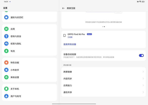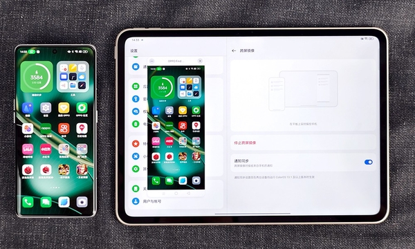 ??針對這兩大問題,OPPO?Pad?2這一次帶來更簡便的方案。只要在設備登陸同一賬號后,不需要在同一個局域網內,只要手機在附近,平板即可無感連接手機5G網絡,完全共享手機通信功能。同樣的,只要是手機平板同賬號并授權后,靠近即可開啟暢快互聯。無需在同一局域網內,就可以實現內容同步、應用接力、跨屏鏡像。比如在手機上復制了一段文字,直接可以在平板上粘貼。