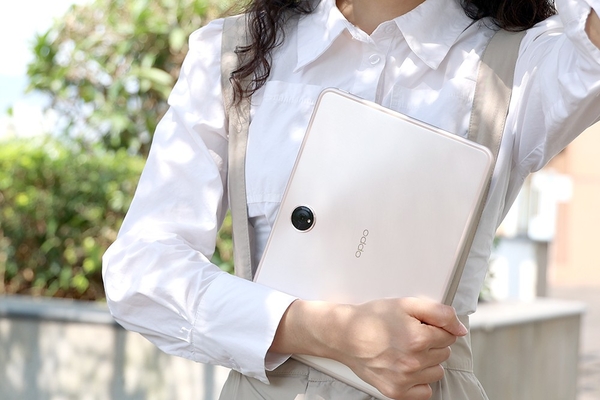 ??整機的重量552克,約是兩部折疊屏手機的重量,手持演示PPT或者隨行記錄負擔不大,差旅攜帶則比筆記本要輕松很多。考慮到用戶便攜使用的場景,OPPO為它特別定制2.5D磨邊CG玻璃,搭配圓角設計與弧形中框,無論是單手還是雙手握持都不會硌手。而且它的機身厚度僅有6.54mm,和一本時尚雜志的厚度差不多,配合全金屬一體化機身和磨砂工藝,手感細膩纖薄感明顯。