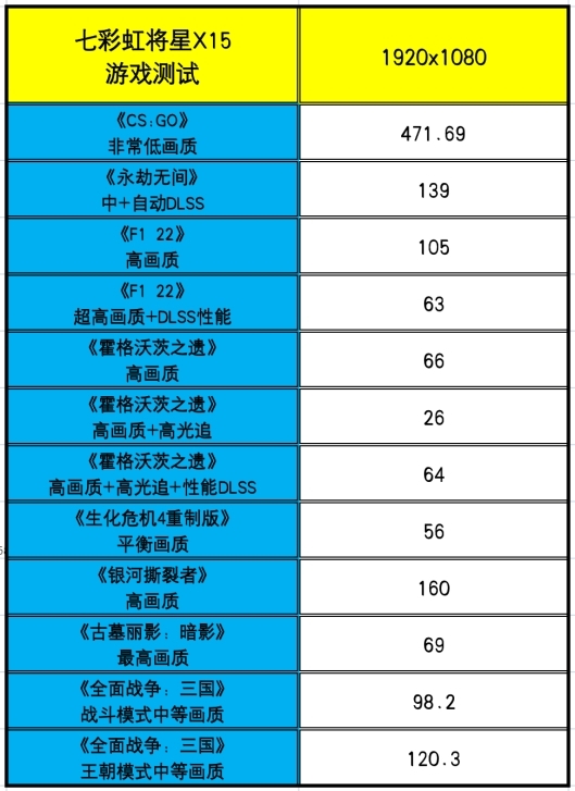 ??選擇《CS:GO》、《永劫無間》、《F1?22》、《霍格沃茨之遺》、《生化危機4重制版》、《銀河撕裂者》、《古墓麗影:暗影》、《全面戰爭:三國》等8款游戲進行測試,平均幀數如下。