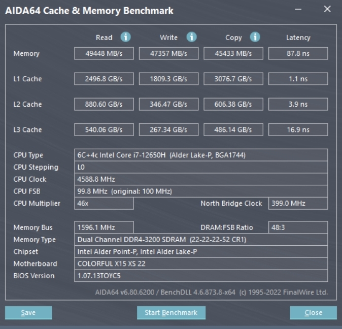 ??內存和存儲方面,將星X15的表現只能說是中規中矩。16GB?DDR4?3200MHz雙通道,讀取速度約50000MB/s,寫入速度約47000MB/s。